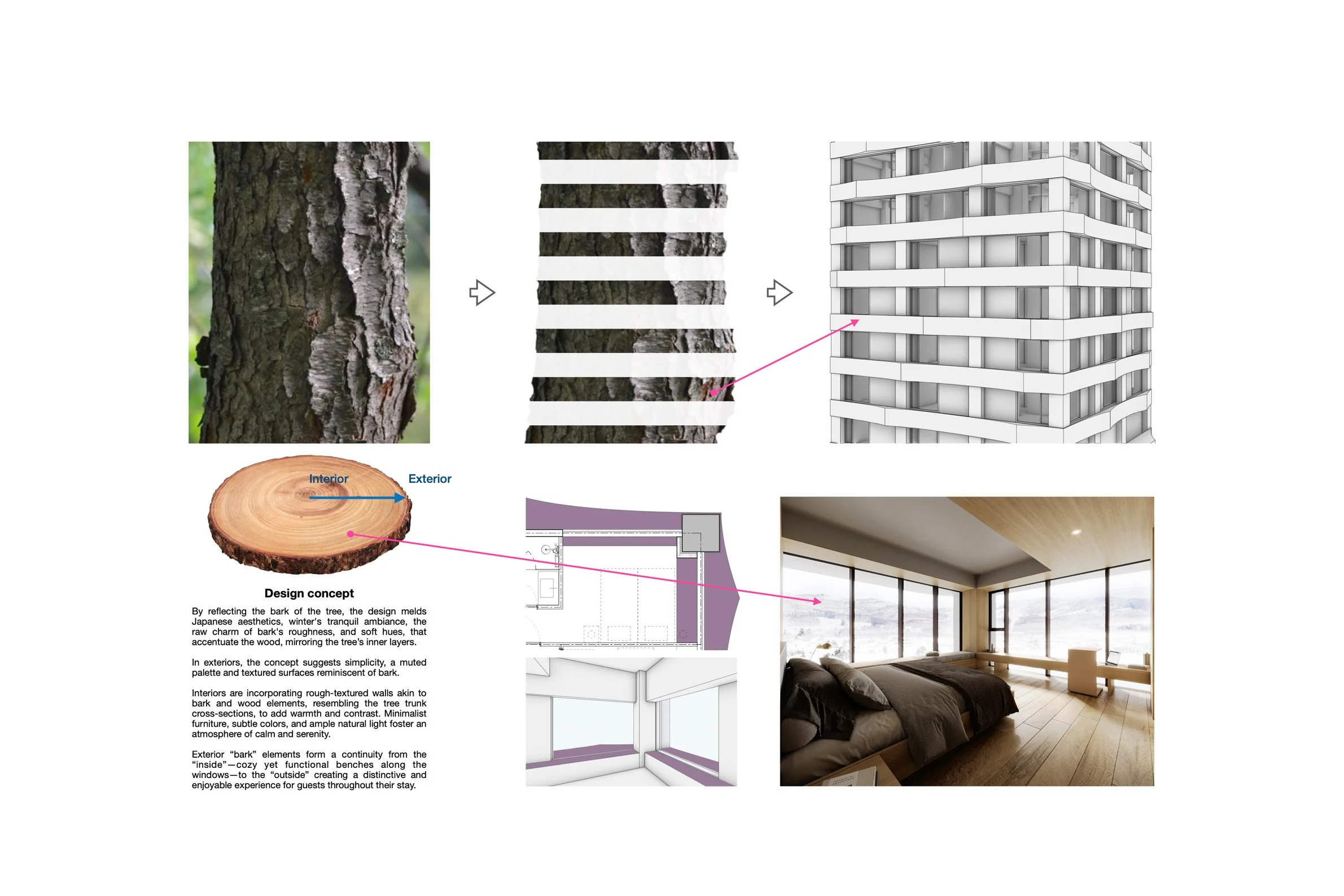 In exteriors, the concept suggests simplicity, a muted palette, and textured surfaces reminiscent of bark.